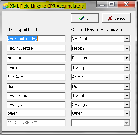 4.A new screen will be displayed which will allow you to link the Certified Payroll Accumulators to the corresponding XML Export Field required by the eCPR reporting system. The required XML fields for eCPR are listed on the left side of the screen and you will need to map your Certified Payroll Accumulators to each XML field using the drop down list fields located on the right side of the screen. NOTE: This is a one time setup and will not need to be changed unless you change any of the Certified Payroll Setup fields in the Payroll Properties Screen.