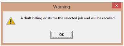 •Create Initial Billing: Create the initial contract billing for review and submission for approval. •Save Draft Copy: Save the draft copy of the contract billing using the Save Draft Button. •Revise / Post Billing: When you are ready to revise or post the contract billing, simply open the billing screen and select the job as normal, if a draft copy exists for the selected job, then you will be notified and the draft copy will opened automatically: