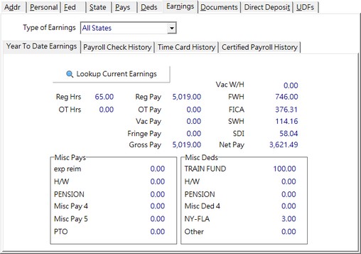 •Year to Date Earnings Tab - Displays summarized earnings for the current calendar year as stored in the employee master file (personal.adt).