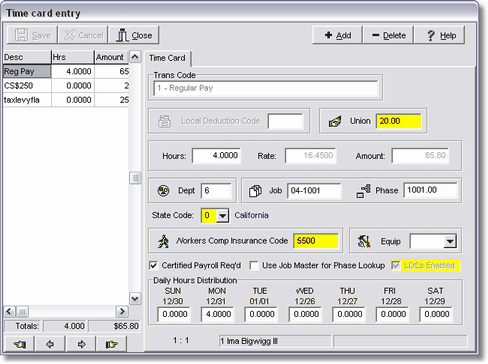 Labor Distribution Codes - LDCs are coding rules that can be created based on the phase in order to prevent user entry errors. LDCs may include a specific workers comp code, union code, state code, and department code. If any LDCs have been created, then the LDCs Enabled check box on the time card screen will be checked (this box cannot be checked by the user). If a phase is entered on the time card screen that is linked to an LDC, then the time card entry will be updated with the linked values of the LDC which will override any other coding already entered including values that may be linked to the employee. (Refer to the 'Business Rules' documentation for more information). The fields that are associated with the LDC will be highlighted in yellow and will remain highlighted until the next transaction is entered.