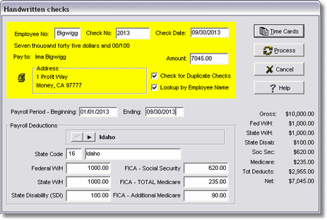 •FICA - Medicare: As of 1/1/2013, an additional medicare tax is due on any amount paid over $200,000 to a single employee. This additional tax is deducted from the employee and is NOT matched by the employer as are the medicare taxes on the first $200,000. In order to segregate this additional tax from the employer burden calculation, the user must enter the TOTAL medicare tax calculated for the check as well as the amount calculated for the additional tax. For example, if the employee is paid $10,000 over the $200,000 limit, the total medicare tax would be calculated as ($10,000 x 1.45%) plus ($10,000 x 0.9%) for a sum of $235.00 and this amount would be entered in the 'FICA - TOTAL Medicare' field. The additional medicare amount of $90.00 must also be entered in the 'FICA - Additional Medicare' field even though it is included in the total medicare field.