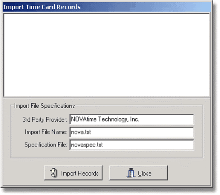 The Import File Specifications section of the screen will display the default Third Party Time Card Provider, the Import File and the Specification File as set up on the Time Card Import Tab of the Payroll - Properties Screen. The import process will be displayed in the dialog box and the following steps are carried out: