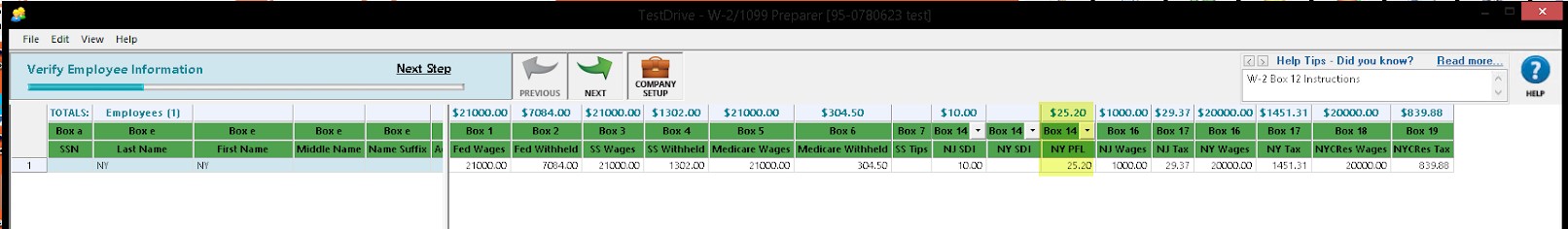 New York - The Family Leave tax is handed through a local deduction code that needs to be implemented and the amount is reported annually on the employee W-2. A|B will automatically print this amount in Box 14 of the W-2; no Box 14 setup is necessary.