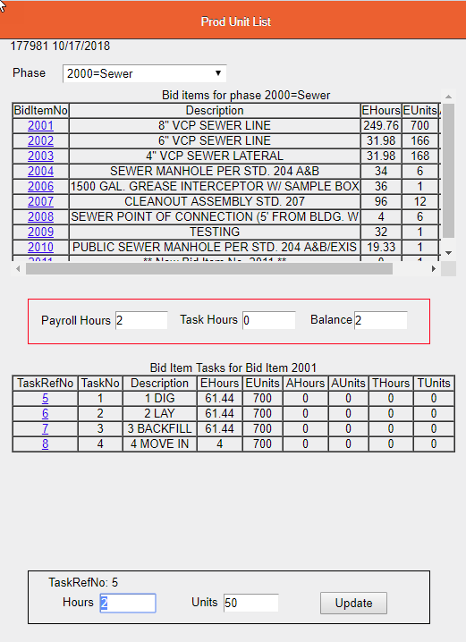 4.After time is entered, the user will choose the Production Units option to allocate the total hours on the DFR to individual tasks. i.Select a job cost Phase - The screen will only display the phases that have time card hours. ii.Select the Bid Item iii.Select the Task; enter the hours and units completed. iv.Click Update button to save the entry. v.Repeat this process for each task that was worked on for the specified date. vi.The Balance field in the middle of the screen will keep track of the task hours that have not yet been allocated to a task. vii.After all Task hours have been entered, select the SAVE button at the top of the screen. •Note: The system will allow you to select the SAVE button even if all the Payroll Hours have not been allocated to Tasks. AB allows this because there might be a situation where the user is called away before he can complete his entry. The goal is to prevent the situation where the user might allocate hours to just ANY task just so that he can save his current entries. Again, the user should review his entries by generating the daily field report for to make sure all hours have been allocated to the PROPER task.
