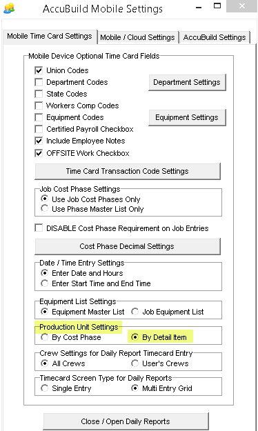 1.First, the File > System Administrator > Mobile Time Card Settings will be set up to report Production Units By Detail Item.