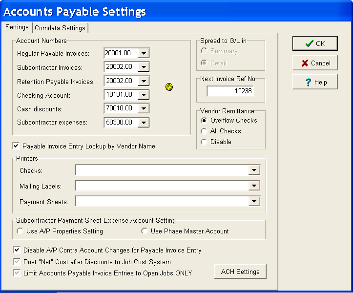 This field simply keeps track of the system's internal reference number for each accounts payable invoice entry. In addition to the vendor's invoice number, AccuBuild logs an internal reference number for each entry associated with the vendor's invoice number. In cases were one invoice may be posted to several different jobs and phases, each partial entry of the one invoice will receive its own unique internal reference number. With rare exception, the Next Invoice Ref No field should not be changed.