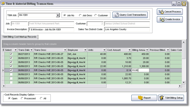The Time and Material (T&M) Billing Feature allows for job cost transactions (payroll, accounts payable, etc) to be billed. Each cost phase on a project must be set up with a single markup billing code which indicates how the costs under that cost phase will be marked up and billed on the customer invoice.
