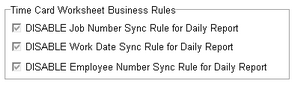 •Rules - This option is used to execute custom SQL script for company business rules. To be able to utilize this new feature, the new 'EnableTCWorksheetBusinessRulesBtn' option must be enabled in File > System Administrator > Configuration > Advanced Settings. This new framework allows for specific processes to be applied to the timecard entries for updating existing records and / or adding new timecard entries for such things as field changes, identifying overtime calculations etc. Refer to the documentation link above for complete information on this feature.