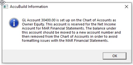 AB will now check for account 30400.00 and give the following warning message (along with the account description) when it is detected: