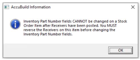 When Stock Order items are edited and the Inventory Part Number is changed, the system will now check to make sure there are no previous receivers for the edited item before allowing the Part Number change to be saved. If receivers exist, and the total quantity for all receiver transactions is not zero, the change will NOT be allowed and the following message will be displayed: